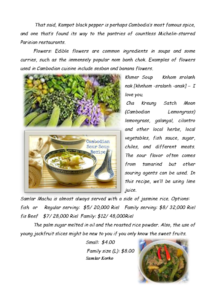 Srey Voleak’s motto “simple and fast” with our own garden herbs and ingredients are always fresh, it reflects Voleak’s commitment to making your meals fresh and fast, the five minutes meals. Our guests may schedule cooking class with Srey Voleak.